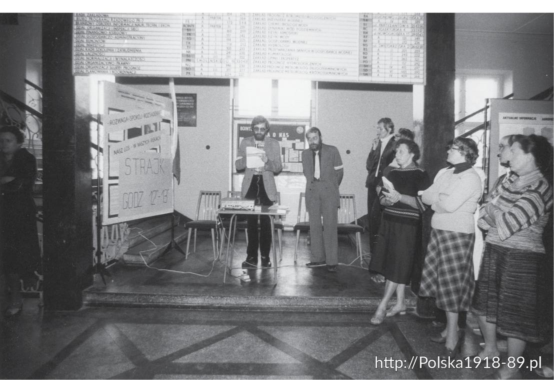 Strajk w budynku administracyjnym Kopalni Węgla Kamiennego "Sosnowiec" w Sosnowcu. W oknie na piętrze wywieszony biały transparent z napisem "STRAJK! ŻĄDAMY PRZYJAZDU WŁADZ NA ROZMOWY Z GÓRNIKAMI KWK SOSNOWIEC" oraz biała flaga z napisem "Solidarność". Przy wejściu do budynku pięciu stojących mężczyzn. Na drzwiach naklejone ulotki, plakaty i afisze. Na ścianie budynku, obok wejścia, widoczne trzy tablice z częściowo widocznymi napisami. Na pierwszej od góry "... KOMITET ZAKŁADOWY ...", na drugiej "... RADA ZAKŁADOWA ...", na trzeciej "... ZARZĄD ZAKŁADOWY KOPALNI WĘGLA KAMIENNEGO "SOSNOWIEC" W SOSNOWCU".